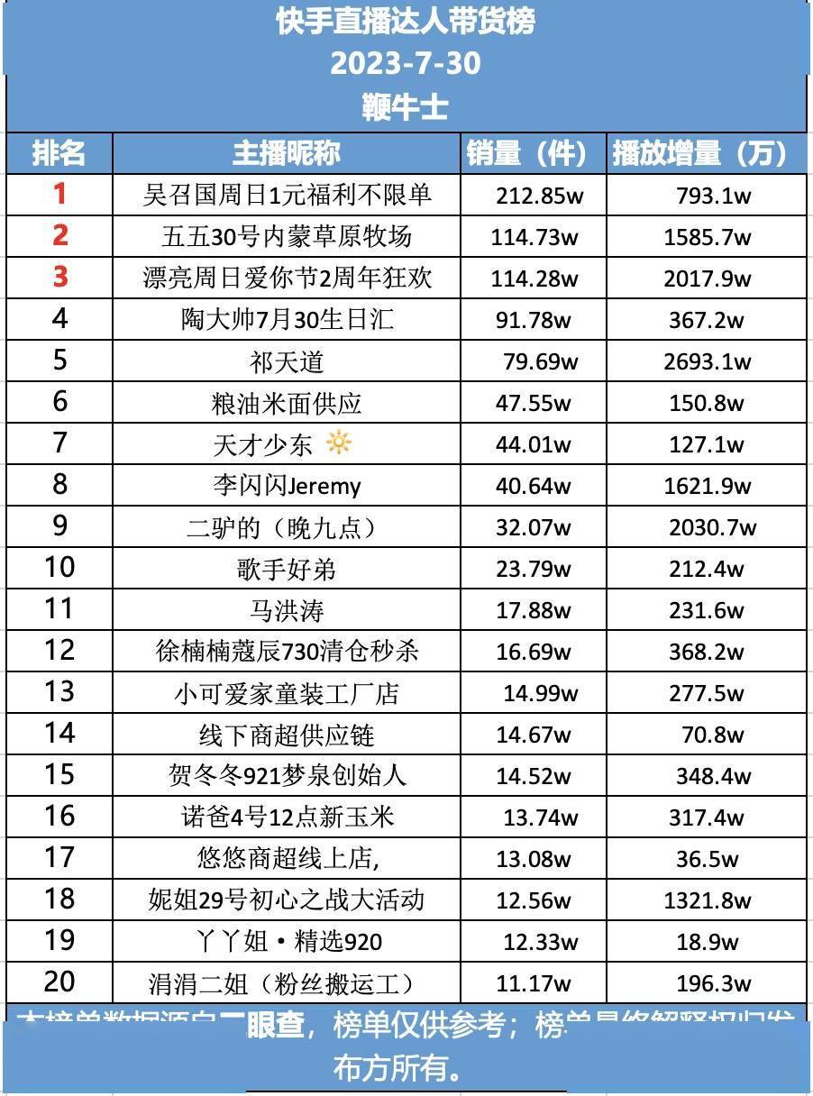 以下为7月30日各平台达人带货情况排名: