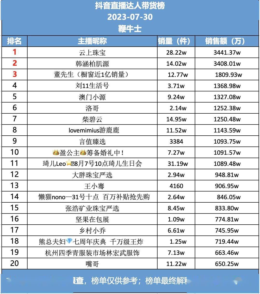 7月30日,抖音直播达人带货榜一是云上珠宝,销售额3441万;榜二韩涵柏肌源,销售额3408万;榜三董先生,销售额1809万。