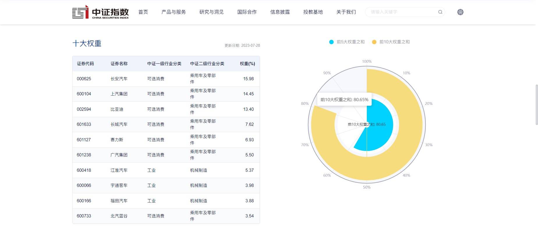 数据显示,截至2023年7月28日,该指数前十大权重股包括长安汽车、上汽集团、比亚迪、长城汽车、赛力斯等。前十大占比高达80.65%。(数据来源:中证指数官网,指数成份股不代表个股推荐)
