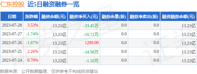 仁东控股融资融券信息显示,融资方面,当日融资买入59.79万元,融资偿还93.24万元,融资净偿还33.45万元。融券方面,融券卖出0.0股,融券偿还0.0股,融券余量0.0股,融券余额0.0万元。融资融券余额13.21亿元。近5日融资融券数据一览见下表: