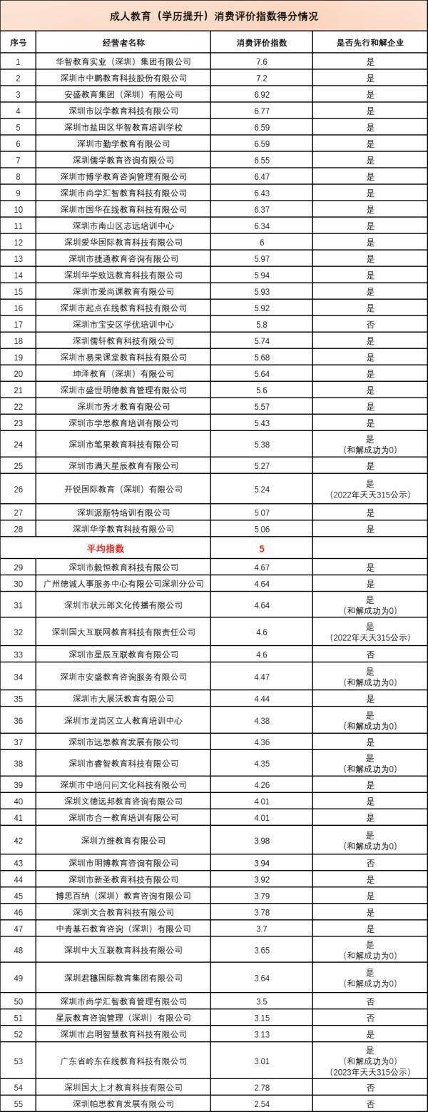 年有效投诉量3宗及以上且投诉主要类别为成人教育(学历提升)的经营者有55家,平均消费评价指数为5.00分。其中,28家经营者高于平均分。排名前三位的是华智教育实业(深圳)集团有限公司(7.60分)、深圳市中鹏教育科技股份有限公司(7.20分)、安盛教育集团(深圳)有限公司(6.92分)。