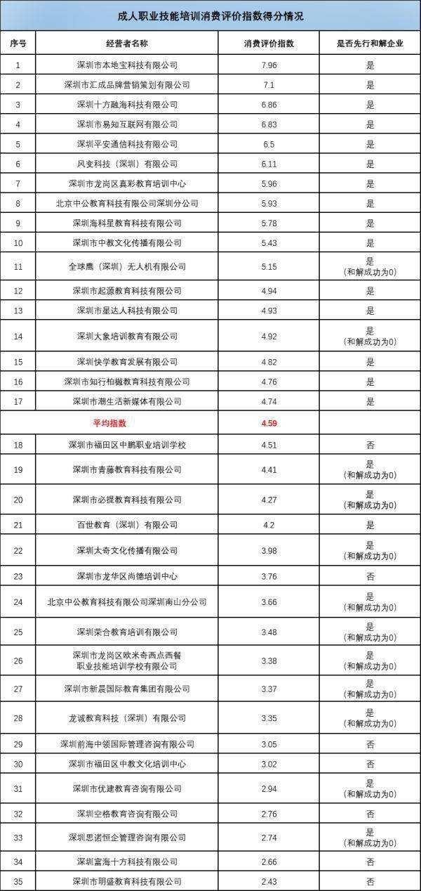 消费评价指数方面,年有效投诉量3宗及以上且投诉主要类别为成人职业技能的经营者有35家,平均消费评价指数为4.59分。其中,17家经营者高于平均分。排名前三位的是深圳市本地宝科技有限公司(7.96分)、深圳市汇成品牌营销策划有限公司(7.10分)、深圳十方融海科技有限公司(6.86分)。