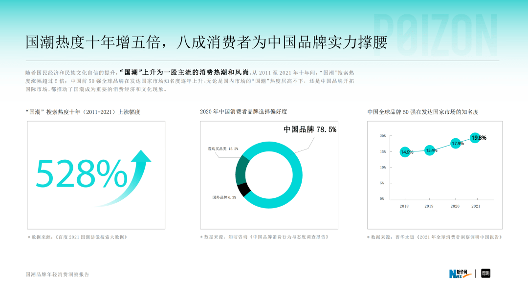 与此同时,基于全面崛起的文化自信、民族自信,年轻人对国潮、体育也是兴趣盎然。新华社联合得物发布的《国潮品牌年轻消费洞察报告》显示,过去十年间,「国潮」的搜索热度上涨了528%,高达78.5%的年轻消费者愿意选择中国品牌。