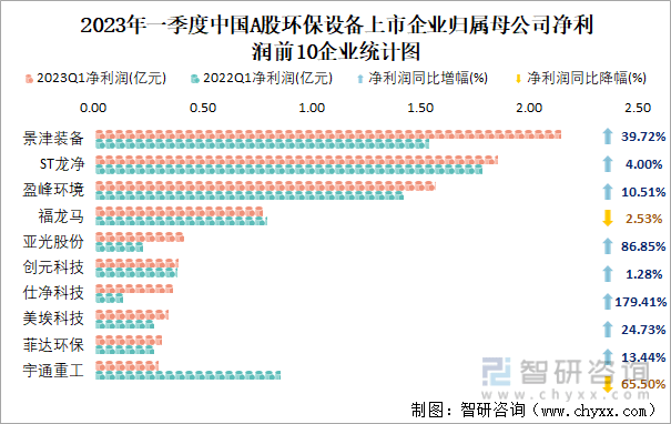 2023年一季度中国A股环保设备上市企业归属母公司净利润前10企业统计图