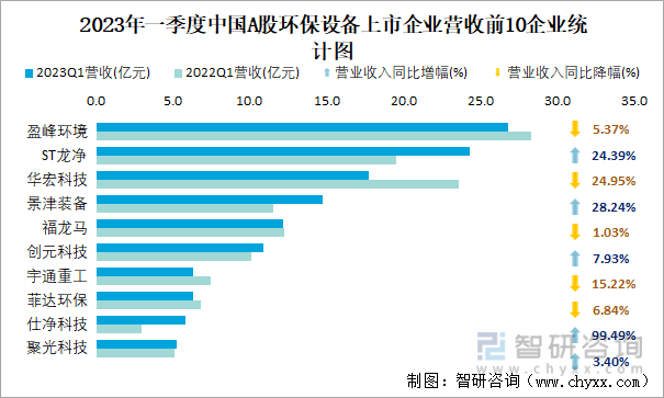2023年一季度中国A股环保设备上市企业营收前10企业统计图