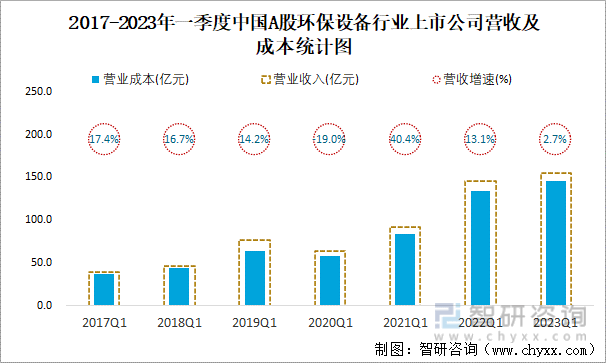 2017-2023年一季度中国A股环保设备行业上市公司营收及成本统计图