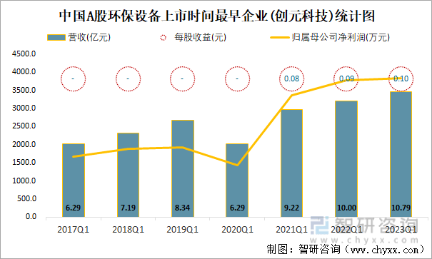 2023年一季度中国A股环保设备上市公司中,截至2023年5月24日,1994年1月6日上市的创元科技上市时间最早,距今约29年,从近几年一季度营收与净利润来看,2023Q1营收最高,有10.79亿元。