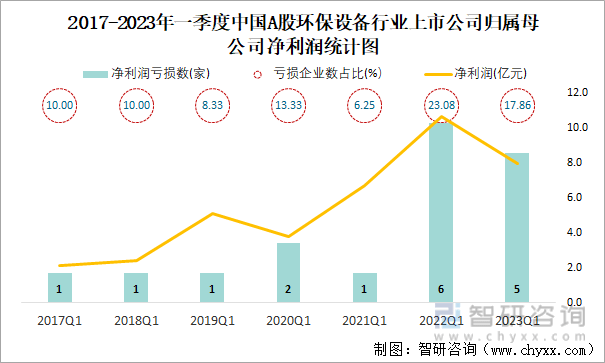 2017-2023年一季度中国A股环保设备行业上市公司归属母公司净利润统计图