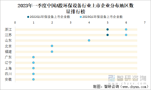 2023年一季度中国A股环保设备行业上市企业分布地区数量排行榜