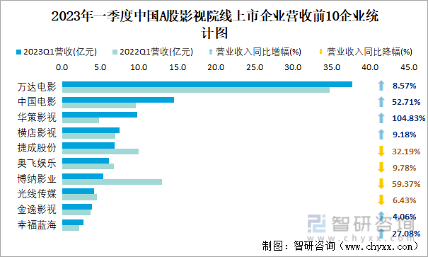 2023年一季度中国A股影视院线上市企业营收前10企业统计图
