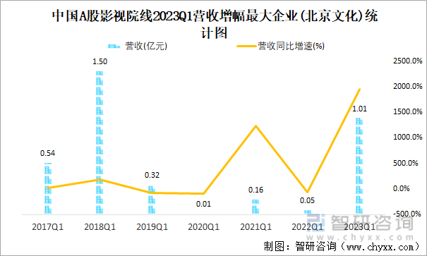 中国A股影视院线2023Q1营收增幅最大企业(北京文化)统计图