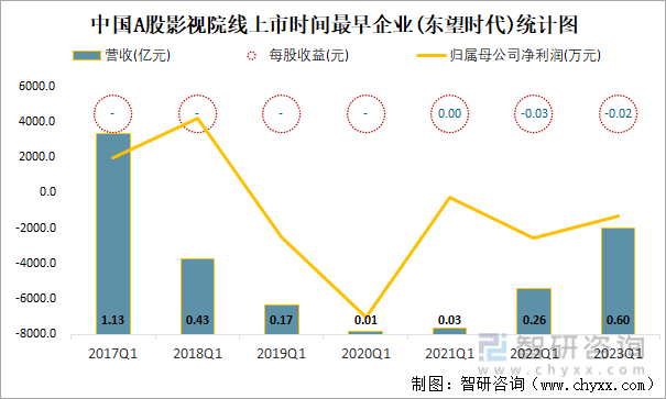 2023年一季度中国A股影视院线上市公司中,截至2023年5月24日,1997年4月15日上市的东望时代上市时间最早,距今约26年,从近几年一季度营收与净利润来看,2017Q1营收最高,有1.13亿元,2020Q1、2022Q1、2019Q1、2023Q1、2021Q1归属母公司净利润亏损。