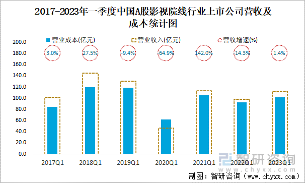 2017-2023年一季度中国A股影视院线行业上市公司营收及成本统计图