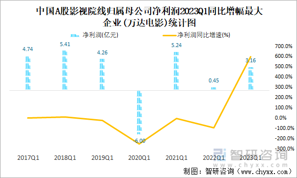 中国A股影视院线归属母公司净利润2023Q1同比增幅最大企业(万达电影)统计图