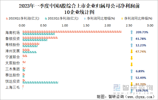 2023年一季度中国A股综合上市公司中,海南机场归属母公司净利润最高,有2.33亿元,净利润增速为209.73%,净利润排名前十的企业中2家企业同比有所下滑。2023年一季度中国A股综合净利润同比增幅最大企业为海南机场,增速为209.73%。