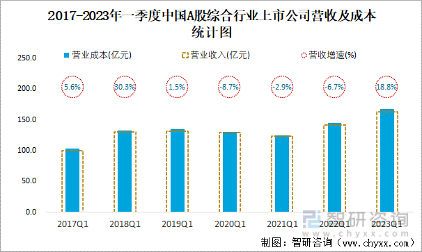 2017-2023年一季度中国A股综合行业上市公司营收及成本统计图