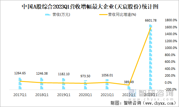 中国A股综合2023Q1营收增幅最大企业(天宸股份)统计图