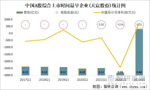 2023年一季度中国A股综合上市公司中,截至2023年5月24日,1992年11月17日上市的天宸股份上市时间最早,距今约31年,从近几年一季度营收与净利润来看,2023Q1营收最高,有0.66亿元,2022Q1、2020Q1、2017Q1、2018Q1、2021Q1归属母公司净利润亏损。