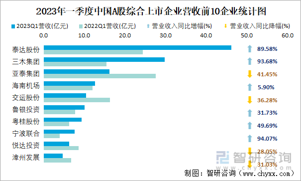 2023年一季度中国A股综合上市公司中,泰达股份营收最多,有45.99亿元,营收排名前十的企业有4家营收同比有所下滑。2023年一季度中国A股综合营收同比增幅最高的企业为天宸股份,增速1594.99%达到6601.78万元。