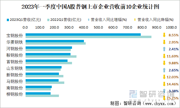 2023年一季度中国A股普钢上市企业营收前10企业统计图
