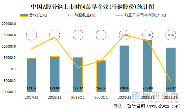 2023年一季度中国A股普钢上市公司中,截至2023年5月24日,1994年1月6日上市的马钢股份上市时间最早,距今约29年,从近几年一季度营收与净利润来看,2022Q1营收最高,有265.8亿元,2023Q1归属母公司净利润亏损。