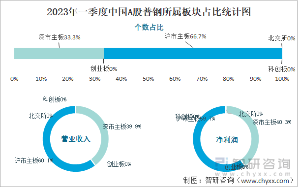 2023年一季度普钢24家上市公司以沪市主板企业数最多,占比66.7%,营收主力为沪市主板,沪市主板净利润占比最多;总营收累计为4511.66亿元,按2023年5月24日统计其上年同期营收减少了6.15%(统计时间有细微差异,24家企业上年一季度营收为4807.51亿元);累计归属母公司净利润为26.44亿元,8家企业净利润出现亏损,占比总企业数的33.33%。
