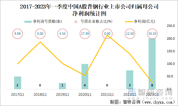 2017-2023年一季度中国A股普钢行业上市公司统计图
