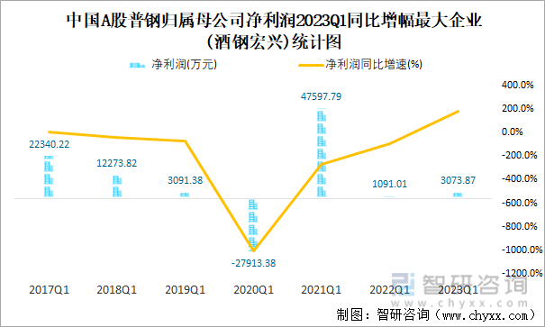 中国A股普钢归属母公司净利润2023Q1同比增幅最大企业(酒钢宏兴)统计图