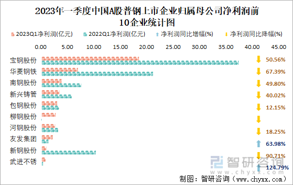 2023年一季度中国A股普钢上市企业归属母公司净利润前10企业统计图
