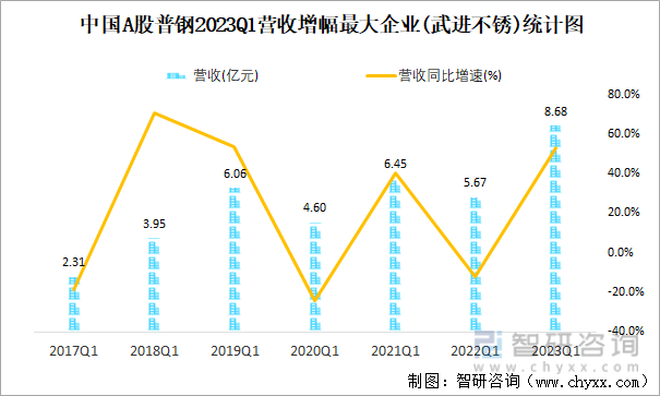 中国A股普钢2023Q1营收增幅最大企业(武进不锈)统计图