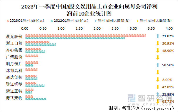 2023年一季度中国A股文娱用品上市企业归属母公司净利润前10企业统计图