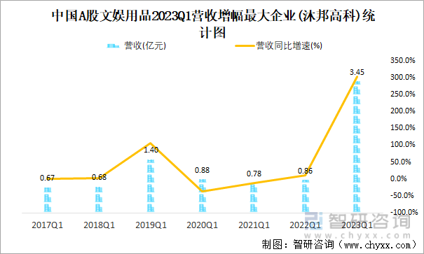 中国A股文娱用品2023Q1营收增幅最大企业(沐邦高科)统计图