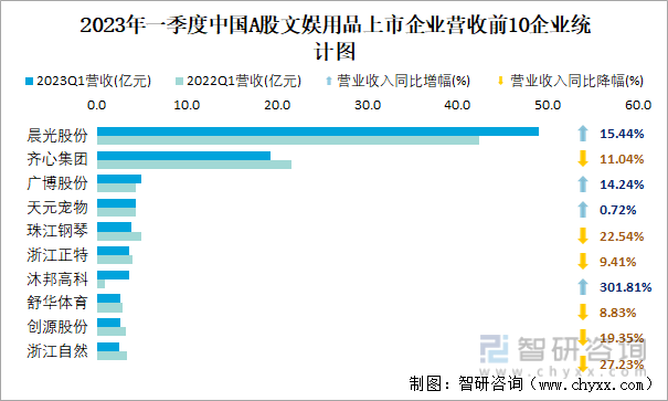 2023年一季度中国A股文娱用品上市企业营收前10企业统计图