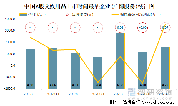 2023年一季度中国A股文娱用品上市公司中,截至2023年5月24日,2007年1月10日上市的广博股份上市时间最早,距今约16年,从近几年一季度营收与净利润来看,2021Q1营收最高,有6.38亿元,2022Q1、2020Q1归属母公司净利润亏损。