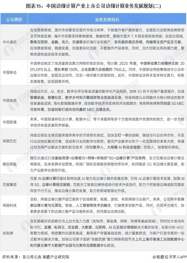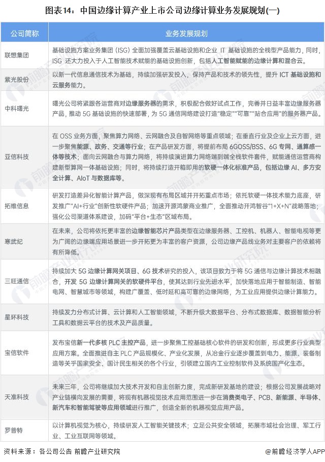 各上市公司根据产业及自身的发展制定了业务发展规划,其中包括产品的丰富、技术的创新以及应用领域的拓展。从代表性上市公司规划来看,未来,边缘计算技术将加深与人工智能、物联网和5G等新一代信息技术的融合,边缘计算应用加速渗透,边缘计算产业和生态愈发成熟。各企业具体规划如下表所示: