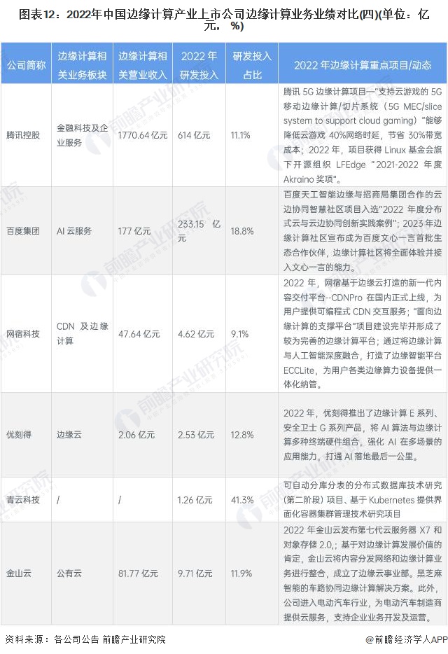 目前,披露了具体边缘计算业务收入的公司有网宿科技、优刻得和寒武纪,其中,网宿科技2022年CDN及边缘计算营业收入达到47.64亿元,占总营收比重为93.7%,从营业收入及业务专注度来看均位于行业前列。从研发投入情况来看,腾讯、阿里研发投入均超过500亿元,远远领先其他企业;寒武纪、星环科技、青云科技研发投入占比超过40%,整体来看,代表性企业均保持高研发投入,推动边缘计算项目的研发。