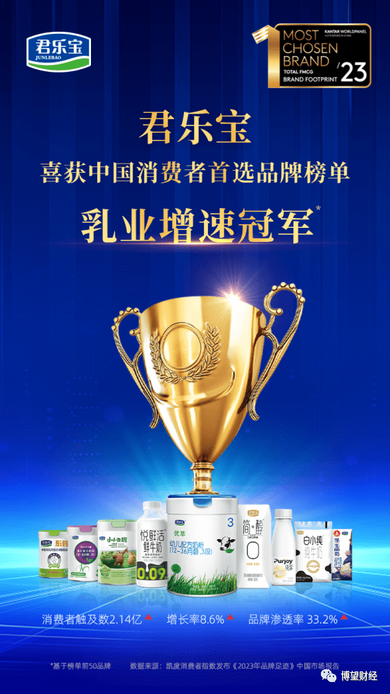 近日,凯度消费者指数披露的《2023年全球品牌足迹报告》显示,君乐宝触及超2亿消费者,并以8.6%的增长率位居中国消费者首选品牌榜单乳业增速冠军。
