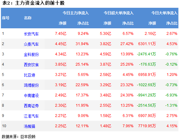 从两市个股主力资金流向来看,长安汽车获主力资金净流入7.45亿,众泰汽车获主力资金净流入4.45亿,金科股份获主力资金净流入4.34亿,西安饮食获主力资金净流入3.85亿,比亚迪获主力净流入3.27亿。