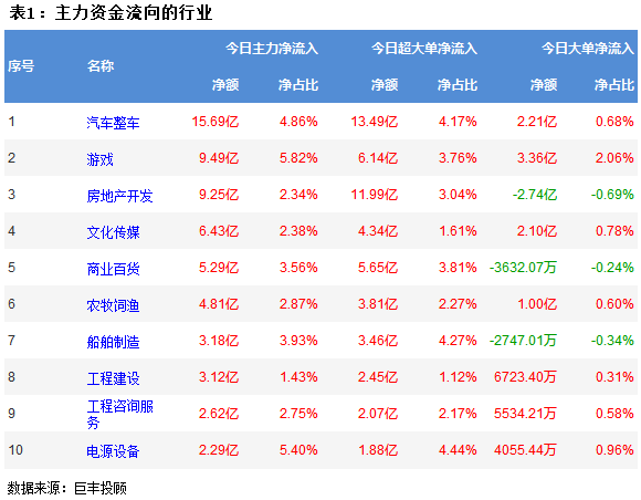 从两市行业板块资金流向来看,汽车整车板块获主力资金净流入15.69亿,游戏板块获主力资金净流入9.49亿,房地产开发板块主力资金净流入9.25亿,文化传媒行业主力资金净流入6.43亿,商业百货板块主力净流入5.29亿。