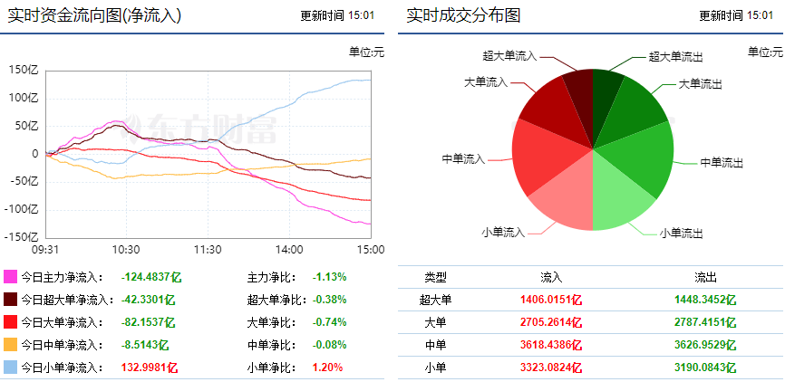 从两市主力资金流向来看,截止收盘,沪深两市主力资金呈现大幅净流出的状态,两市共流出124.4837亿元。其中,超大单净流出42.3301亿元,大单净流出82.1537亿,中单净流出8.5143亿元,小单净流入132.9981亿元。