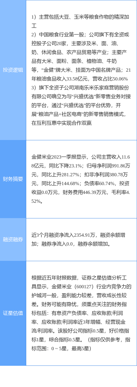 金健米业涨停收盘,收盘价8.47元。该股于9点33分涨停,9次打开涨停,截止收盘封单资金为3476.0万元,占其流通市值0.64%。