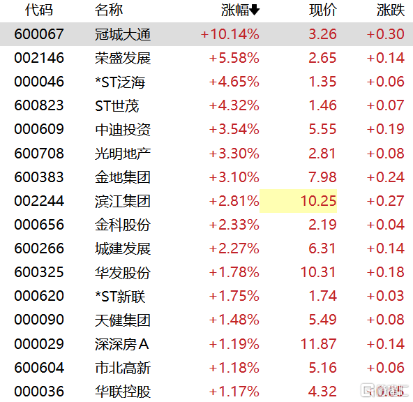 截止发稿,冠城大通涨停,荣盛发展涨超5%,中迪投资、光明地产、金地集团涨超3%,滨江集团、城建发展、金科股份、华联控股等跟涨。