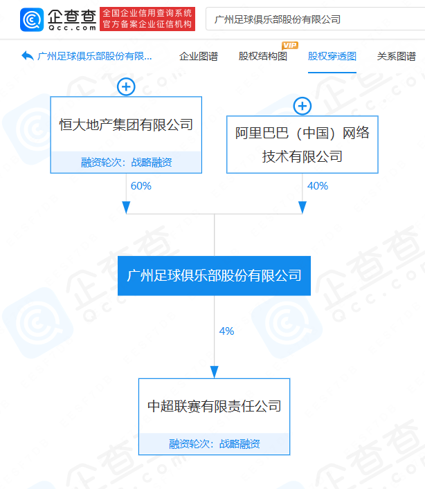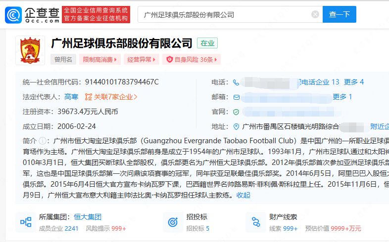 企查查信息显示,广州足球俱乐部股份有限公司成立于2006年2月,注册资本约3.97亿人民币,由恒大地产集团有限公司、阿里巴巴(中国)网络技术有限公司共同持股。