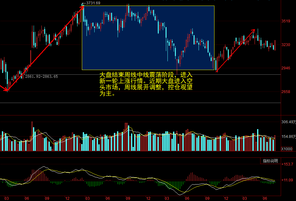 中期来看,大盘现处于中期震荡后的上涨行情。短期来看,大盘快速调整进入空头市场,周线展开调整,短期控仓观望为主。