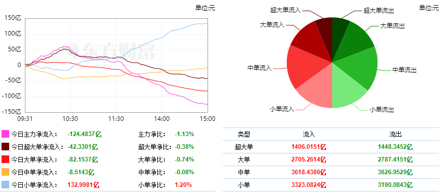 根据东财统计,截止收盘沪深两市呈现资金净流出状态,当日沪深两市资金当日沪深两市资金共流出124.48亿元。其中,超大单净流出42.33亿元,大单净流出82.15亿,中单净流出8.51亿元,小单净流入133.0亿元。
