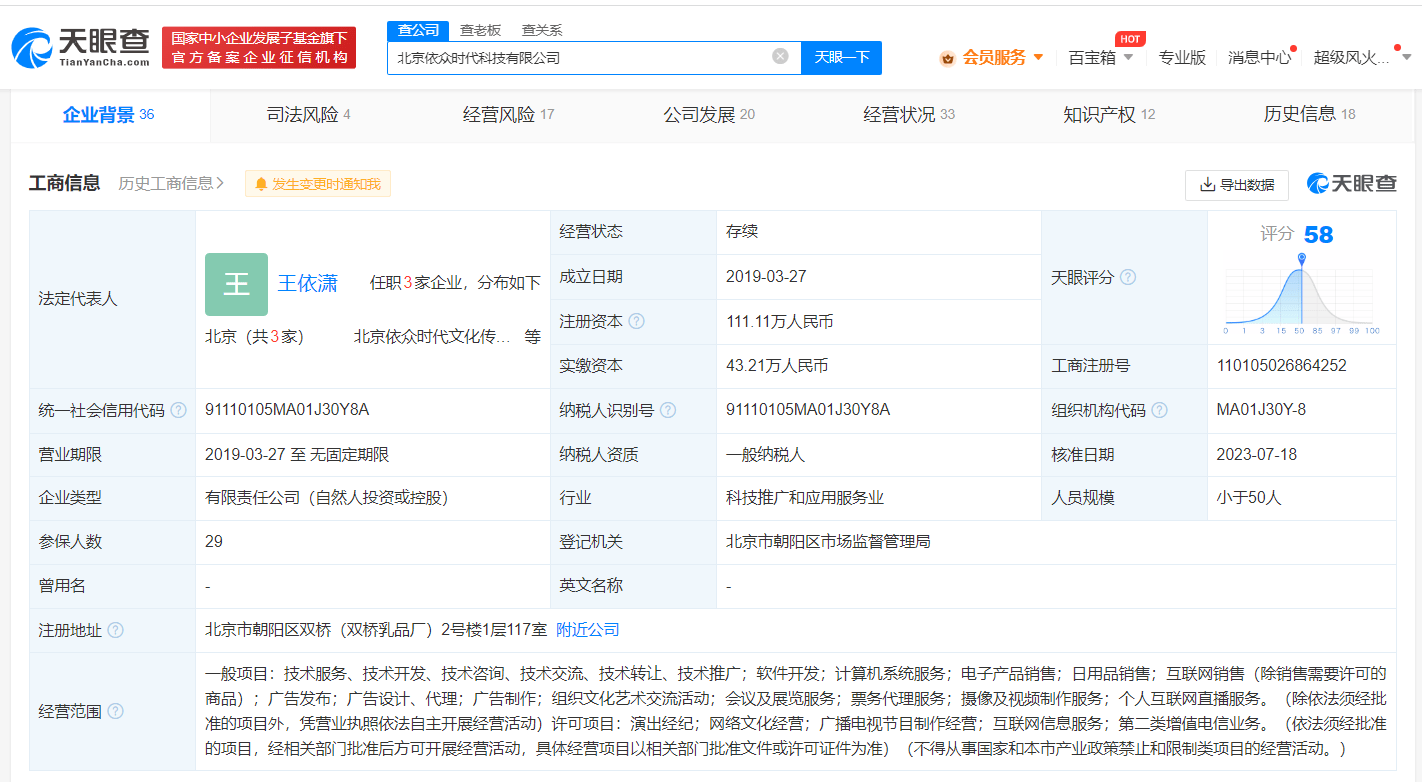北京依众时代科技有限公司成立于2019年3月,法定代表人为王依潇,经营范围包括技术服务、互联网销售、组织文化艺术交流活动、演出经纪、网络文化经营等。据悉,依众时代是一家XR垂类MCN机构。