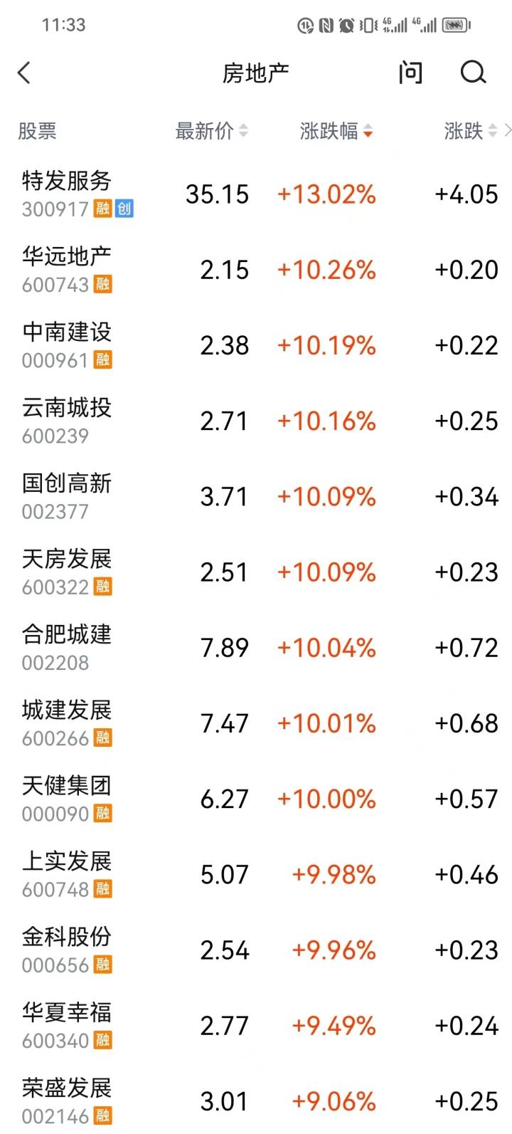 房地产板块中,特发服务涨超13%,华远地产、中南建设、云南城投、天房发展、合肥城建、上实发展、金科股份、华夏幸福涨停。
