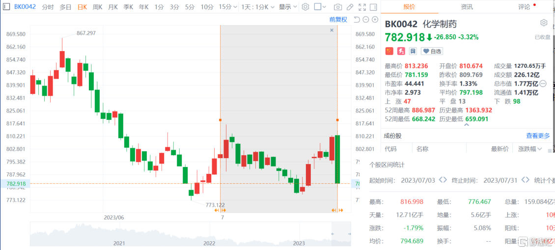 其中,医药股“龙头”恒瑞医药逼近跌停,收跌9.11%报44.58元,总市值2843.76亿元。整个7月,该股累计跌幅近7%。对于今日的大跌,恒瑞医药方面回应表示:“股价波动受多种因素影响,公司经营正常。”