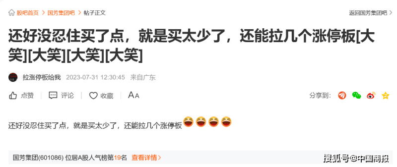 7月31日,“股吧”部分股友纷纷发帖交流A股零售股国芳集团当日的涨停表现。其中,一些买了国芳集团股票的股友掩饰不住内心的喜悦,第一时间发帖分享心得。