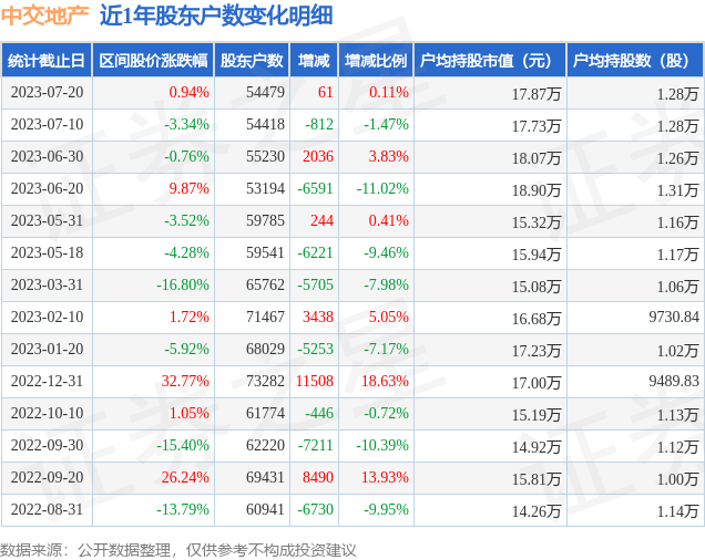 从股价来看,2023年7月10日至2023年7月20日,中交地产区间涨幅为0.94%,在此期间股东户数增加61.0户,增幅为0.11%。